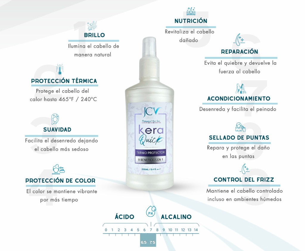 KeraQuick JCV es un restaurador intenso de las hebras capilares, de textura fluida como el agua, que se termoactiva o fija con el aplanchado. No alisa el cabello: está pensado para quienes desean restaurar sin cambiar la forma natural. La duración esperada es de al menos un mes, según lavados, champú y procesos posteriores. En cabellos rizados, tras el alisado temporal con plancha el rizo recupera su forma, a menudo más definido. Se recomienda mantener con Shampoo Sulphate Free, Hair Conditioner y, ocasionalmente, Hydrating Hair Mask (contenido histórico jcvcosmetics.com/keraquik).